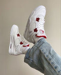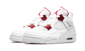 This Jordan 4 features a white leather upper with white netted underlays and Metallic Red detailing on the upper eyelets. A Metallic Red Jumpman logo on the heel, white sole, and Metallic Red Air bubble complete the design.